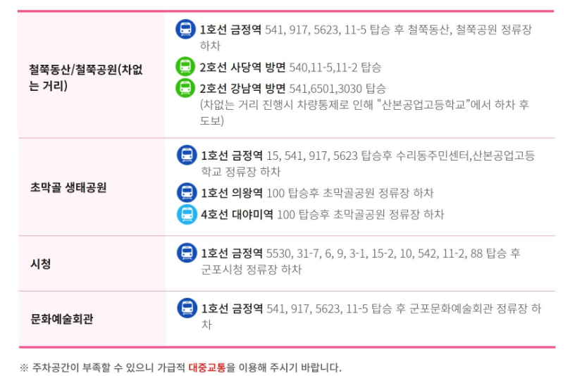 - 자가용: 산본고등학교, 군포시청 등 임시 주차장 이용 후 셔틀버스 탑승