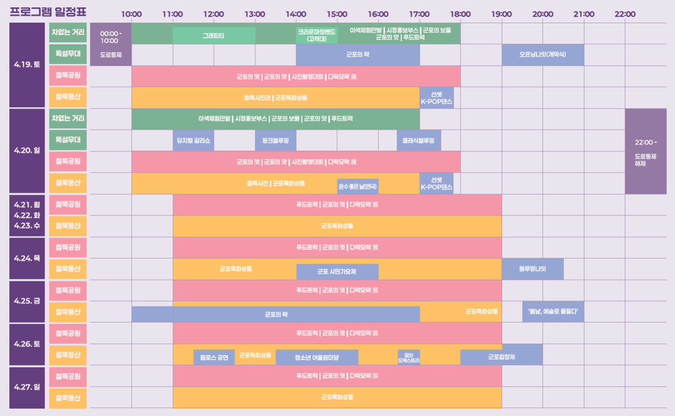 체험 부스에서는 철쭉 화분 만들기, 철쭉 그림 그리기, 천연 염색 체험 등 온 가족이 함께 즐길 수 있는 다양한 활동이 마련됩니다. 또한 지역 특산품과 먹거리를 판매하는 부스도 운영되어 군포의 맛을 느낄 수 있는 기회가 될 것입니다.